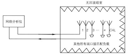 (3)將測量系統(tǒng)與被測天線的校準(zhǔn)端口和第i個饋電端口相連接,被測天線的其余端口一律接匹配負(fù)載,在工作頻率范圍內(nèi)進(jìn)行傳輸系數(shù)S(i,CAL)的測量;