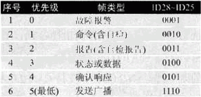 本協(xié)議采用幀優(yōu)先原則分配標(biāo)識符,每一幀標(biāo)識符中的高四位表示幀類型,不同幀類型有不同的優(yōu)先權(quán),優(yōu)先權(quán)決定了各種信息幀在同等情況下的發(fā)送順序,協(xié)議中的29位標(biāo)識符的分配如下: