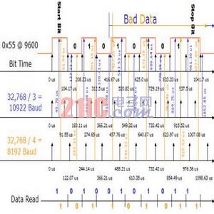 UART數(shù)據(jù)用10,922波特或8,192波特的UART接收。由于UART在傳輸中間點(diǎn)對(duì)數(shù)據(jù)進(jìn)行采樣以補(bǔ)償抖動(dòng),因此該點(diǎn)已經(jīng)被選擇為接收UART的采樣點(diǎn)。在沒有行抖動(dòng)的理想情況下,10,922波特UART對(duì)第三數(shù)據(jù)位的開始兩次讀數(shù)都會(huì)是錯(cuò)誤的而8,192波特的UART由于會(huì)完全遺漏第三位,很快就將出錯(cuò)。由于低功耗應(yīng)用的理想時(shí)鐘是低功耗實(shí)時(shí)時(shí)鐘模式,這使得在低功耗環(huán)境中處理很困難。解決這一問題的最好辦法就是將µC與調(diào)制技術(shù)結(jié)合使用,用32kHz振蕩器提供非常精確的2,400波特,并完全能支持9,600波特(參見圖3)。