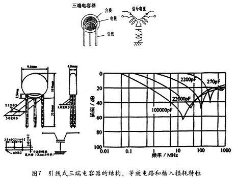 由于普通的兩端電容有引線電感,所以總的剩余電感較大,自諧振點(diǎn)也比較低。為了改進(jìn)普通引線式電容器的自諧振、且自諧振頻率偏低的問題,村田制作所曾發(fā)展了一種引線式三端電容器,見圖7。與兩端電容相比,這個(gè)電容的上引線化成了兩根(所以三端電容有三根引線)。三端電容器的這兩根上引線化成了信號(hào)傳輸線的一部分,于是引線電感與電容器變成了一個(gè)“LC”濾波器。正是三端電容器巧妙地利用了引線電感,使得三端電容器對干擾的抑制作用更好。三端電容器也有自諧振問題,為了最大限度地限制這個(gè)問題,使用時(shí)三端電容器接地的這根引腳的長度應(yīng)該受到限制。
