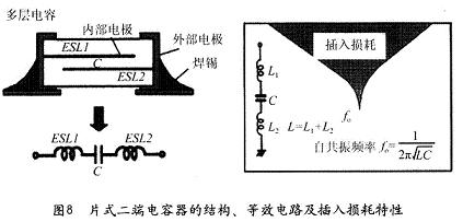 應(yīng)該說片式二端電容器的出現(xiàn)對于改進(jìn)普通引線式電容器的自諧振問題是很有好處的,因?yàn)槠蕉穗娙萜鞯囊€長度得到了最大限度縮減。但由于電容器內(nèi)部的構(gòu)造,并不能夠消除內(nèi)部電極的殘留電感,這樣當(dāng)頻率達(dá)到使電容器的容抗XC同殘留電感的XL的絕對值相等時(shí),二端電容依然會(huì)產(chǎn)生自諧振,參見圖8。由于自諧振頻率的存在,當(dāng)噪聲的頻帶超過自諧振頻率之后,噪聲的抑制效果會(huì)急速下降。但是與普通有引線的二端電容相比較,還是有很大改進(jìn)。