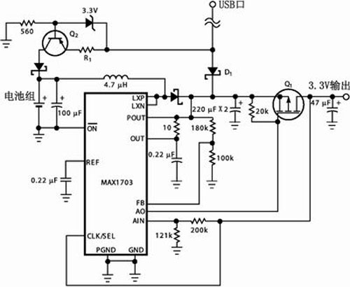 不少便攜式USB設(shè)備脫離主機(jī)后改由內(nèi)部電池組通過(guò)直流變換器繼續(xù)供電,故而需要配備一個(gè)小型UPS電源,圖3便是一種由單片開(kāi)關(guān)電源MAX1703構(gòu)成的實(shí)用電路。該集成器件采用同步整流PWM升壓型電路結(jié)構(gòu);可以單節(jié)鎳鎘/鎳氫電池供電,最低輸入電壓0.7V,輸出電壓可調(diào)范圍為2.5~5.5V,最大輸出電流1.5A,電源變換效率可達(dá)95%。圖3中,MAX1703開(kāi)關(guān)電源“POUT”端的輸出電壓設(shè)定為3.4V,而由P溝道場(chǎng)效應(yīng)管Q1與片內(nèi)備用放大器構(gòu)成的線性穩(wěn)壓器輸出電壓為3.3V,故而USB外設(shè)由電池組供電時(shí)Q1的功率損耗幾乎可以忽略。外部設(shè)備與USB口接通時(shí),二極管D1為正向偏置而使開(kāi)關(guān)電源處于“空閑”狀態(tài);也就是只要Q1的源極電壓高于3.4V,外部設(shè)備便始終由USB口供電。與此同時(shí),USB口還通過(guò)PNP晶體管Q2等組成的恒流源向電池組充電,調(diào)整電阻R1的阻值可以設(shè)定充電電流,使之符合十小時(shí)充電制的要求。一旦外部設(shè)備脫離USB口,開(kāi)關(guān)電源便會(huì)立即退出“空閑”狀態(tài)而由內(nèi)部電池組繼續(xù)供電。