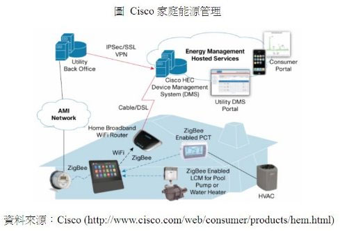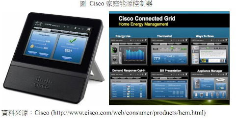 在綠色節(jié)能觀念的日益普及趨勢下,有效管理家中用電的家庭能源管理(Home Energy Management,HEM)成為智慧電網(wǎng)公共建設(shè)外,另一項具備高度發(fā)展?jié)摿Φ氖袌鲱I(lǐng)域。面對民眾對節(jié)能管理的需求,現(xiàn)階段陸續(xù)已有許多國際大廠投入相關(guān)應(yīng)用與服務(wù)的研發(fā);除了Google推出PowerMeter的用電監(jiān)測網(wǎng)路平臺外(需搭配智慧電表或插座等設(shè)備),Cisco與Intel也陸續(xù)搭上平板電腦熱潮,推出協(xié)助民眾管理家庭用電的HEM裝置。相較于Google PowerMeter,Cisco與Intel所推出產(chǎn)品是以物聯(lián)網(wǎng)(Internet of Things,IoT)概念為基礎(chǔ),透過無線網(wǎng)路模式連結(jié)家中各項電器設(shè)備,進行用電資訊的傳遞與監(jiān)控,同時進行遠端遙控動作。 Cisco推出包含家庭能源控制器(Home Energy Controller,HEC)與能源管理服務(wù)平臺的家庭能源管理解決方案(Home Energy Management Solution,HEMS),作為進入家庭節(jié)能市場的第一步。 HEC如同家庭中的監(jiān)控中心,除了可以在螢?zāi)簧霞磿r顯示家中用電的即時狀態(tài)資訊外,使用者透過觸控面板的HEC還可以對連線的家電產(chǎn)品進行操控,決定是否關(guān)閉或調(diào)整特定家電來節(jié)省電力消耗。
