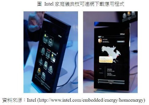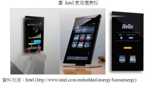在家庭能源管理的概念下,Intel也推出暫稱為「家庭儀表板(Home Dashboard)」的整合性解決方案,產(chǎn)品設(shè)計為一個具備運算能力且低耗能的平板電腦。 Intel規(guī)劃此產(chǎn)品成為家庭網(wǎng)路的核心(Heart of the Home Network),使用者可與智慧家電、智慧插座、智慧電表與家中各項感測裝置進行連結(jié)與監(jiān)控動作,并進行家電設(shè)備的安全設(shè)定、溫控設(shè)定、電源