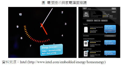如同前述的家庭能源管理項目,Intel儀表板透過ZigBee無線技術(shù)連結(jié)家中的各項家電,監(jiān)控用電狀況。此外,透過WiFi連結(jié)家中寬頻網(wǎng)路,可與當?shù)氐碾娏具M行資訊傳遞或更新(或透過Zigbee技術(shù)與智慧電表連結(jié),進一步與電力公司連線)。而透過儀表板上顯示的差異電價時段或市面上各項家電的耗能(節(jié)費)資訊,儀表板可以提供使用者用電與家電購置的建議,甚至可協(xié)助計算需使用多久的時間才能回本。