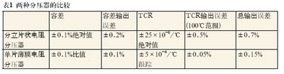 表1匯總了這兩種方法。使用0.1%的分立電阻設(shè)計(jì)分壓器時(shí),由容差和TCR引入的最大輸出誤差是0.7%。使用高精度薄膜電阻時(shí)的最大輸出誤差是±0.15%——性能方面超過4倍的改善。