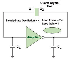 如果皮爾斯拓?fù)浣Y(jié)構(gòu)的非線性增益大于某個最小值,而且非線性延時提供了滿足接近石英晶體單元串聯(lián)諧振頻率相移條件的足夠相移,它就可以很好地使振蕩頻率接近石英晶體串聯(lián)諧振頻率而使振蕩器進(jìn)入穩(wěn)態(tài)。如果振蕩能夠滿足這些條件,當(dāng)放大器延遲改變時,輸入/輸出放大器的波形幅值包跡將隨著時間增加,直到穩(wěn)態(tài)振蕩條件得到滿足。在許多情況下,當(dāng)峰峰值輸出幅值達(dá)到供電電壓和地之間的差值時,放大器增益就可以達(dá)到一個基本不變的穩(wěn)態(tài)值。