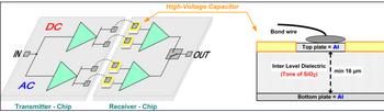 圖2的右側(cè)顯示了一個高壓電容器的橫截面。從發(fā)送器芯片出來的接合線連接到接收機(jī)端電容器鋁頂板。底板(也為鋁質(zhì))連接到接收機(jī)邏輯。板之間是夾層電介質(zhì),其為16-μm厚的二氧化硅(SiO2)層。