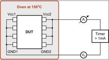 實(shí)際上,周圍溫度維持在150oC時,TDDB由隔離器的施加應(yīng)力電壓決定(請參見圖5)。測試之初便激活一個計時器,其在隔離器電流超出1mA時停止,表明電介質(zhì)擊穿。記錄每個測試電壓的故障時間,并根據(jù)理論E模型曲線進(jìn)行繪圖。