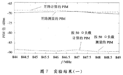 由以上的分析可知,這種計算方法計算出來的PIM值和真實的PIM值十分接近,并且隨頻率的變化趨勢一致。同時可以看出,在開路的時候所測量的 PIM明顯要比接負(fù)載的時候所測量的PIM要大,增大的PIM值是因為匹配不好所造成,當(dāng)然,相同的負(fù)載狀況在不同的頻率下呈現(xiàn)的匹配狀態(tài)是不一樣的。