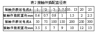 再根據(jù)計算出的接觸件額定電流值查出接觸件插配直徑(見表2)。