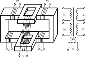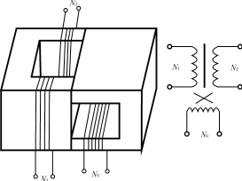 從20世紀(jì)80年代末開始,對(duì)由垂直形鐵心構(gòu)成的立體布置的多功能鐵心結(jié)構(gòu)進(jìn)行研究的人員越來越多。最早是有人把C形鐵心的一半轉(zhuǎn)90°而形成的,發(fā)現(xiàn)在沒轉(zhuǎn)90°的C形鐵心上的繞組之間仍存在變壓器功能,轉(zhuǎn)90°的C形鐵心上繞上一個(gè)繞組,可以通過電流激磁后,改變沒轉(zhuǎn)90°的C形鐵心上繞組的電感〔見圖11(a)〕。后來把鐵心去掉一些變成圖11(b),仍然具有這樣的功能。圖11(c)是把兩個(gè)變壓器和兩個(gè)可控電感組合在一起的多功能鐵心結(jié)構(gòu)。