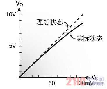 通常k>2,故R2>R1。這表明,在電阻器R2中的功耗和溫升總會超過在電阻器R1中的功耗和溫升。即使兩個電阻器均具有相同的TCR(理想情況),該放大器的增益也將變化,這是因?yàn)镽2/R1比率將取決于輸出電壓VO。因而,聲音信號的典型尖峰和脈沖可能造成放大器增益的瞬態(tài)變化。其結(jié)果是輸入電壓VI和輸出電壓VO之間的非線性依賴(圖4)。這個現(xiàn)象稱作溫度引起的放大器的非線性。其原因是電阻器的自熱,其定量的特點(diǎn)是電阻功率系數(shù)(PCR)。減小電阻功率系數(shù)(PCR)的方法是選擇具有最小絕對TCR值的R1和R2電阻器。
