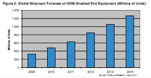 據(jù)IHS iSuppli公司的研究,液晶電視和其它高級數(shù)字設備的事實性連接標準HDMI,將被2011年出現(xiàn)的將近6.3億個消費電子產(chǎn)品采用,充當主要的設備接口,盡管在中國面臨另外一種標準的挑戰(zhàn)。
