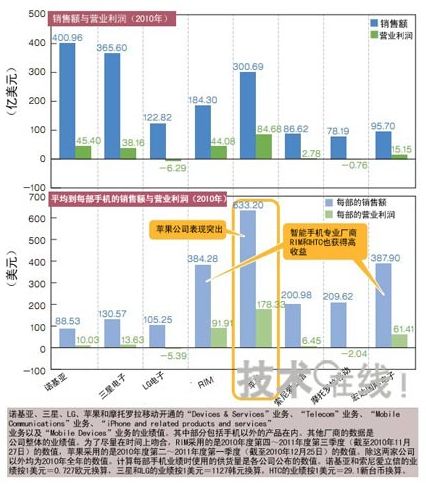 各大廠商的2010年手機業(yè)務(wù)全年業(yè)績。諾基亞在按銷售額的排名中位居榜首,不過在按營業(yè)利潤的排名中,蘋果以將近2倍的差遙遙領(lǐng)先于位居第二的諾基亞。換算到每部手機上,蘋果的銷售額和營業(yè)利潤較其他公司高出很多。