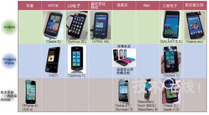 智能手機的平臺集中在Android、Windows Phone以及各廠商自主產(chǎn)品這三個平臺上。本圖以各廠商2011年發(fā)布的機型為中心,只標示了具有代表性的產(chǎn)品。采用自主平臺的廠商還自行準備了應(yīng)用商店等網(wǎng)絡(luò)服務(wù)。