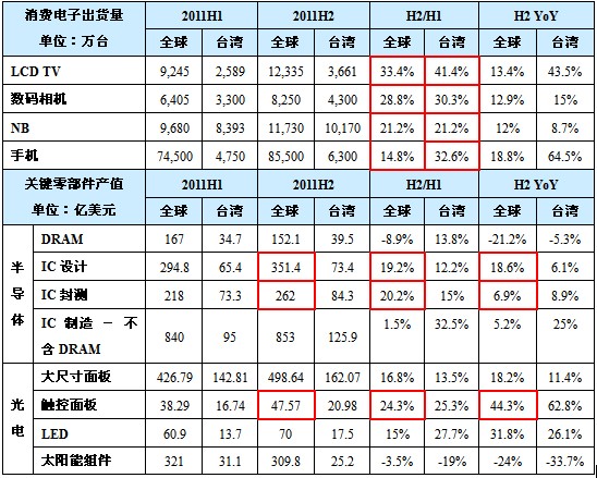 2011上下半年主要消費(fèi)電子及關(guān)鍵零組件成長(zhǎng)幅度比較