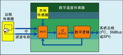 具體來說,數(shù)字溫度傳感器的主要構(gòu)成包括一個雙電流源、一個Δ-Σ A/D轉(zhuǎn)換器、數(shù)字邏輯和一個通向數(shù)字器件(如與一個微處理器或微控制器連接)的串行接口(如I2C總線、SMBus或SPI)。數(shù)字溫度傳感器有兩種:本地或遠程溫度傳感器,它們均采用某種方法強制兩個成比例的電流通過一個連接成二極管形式的NPN或PNP晶體管,均用于測量所導(dǎo)致的VBE變化,使用Δ-ΣA/D轉(zhuǎn)換器對電壓采樣并將數(shù)值轉(zhuǎn)換成數(shù)字格式。強制電流一般采用約10:1的比例。通過強制施加比例電流和測量兩個VBE的差值,可消除二極管上IS這一與工藝相關(guān)參數(shù)的一階效應(yīng)。