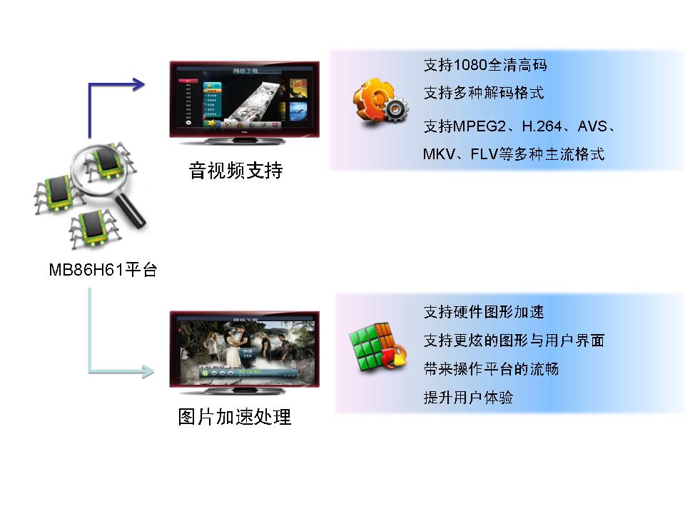 MB86H61系列芯片基于多核CPU架構(gòu),內(nèi)部集成了富士通獨(dú)有專利技術(shù)的硬件視頻處理器視頻解碼單元解碼全高清/標(biāo)清MPEG-2、H.264、VC-1、AVS、FLV、MKV等多種視頻格式,而音頻解碼單元?jiǎng)t采用高性能的ARC725TM(594DMIPS)支持DD、DD+、AAC、DRA等多種先進(jìn)音頻格式。因此,該芯片的ARM11內(nèi)核主CPU將全部用于處理應(yīng)用程序,其性能將有足夠的裕量,能充分保證系統(tǒng)運(yùn)行的平穩(wěn)流暢。“獨(dú)立的硬件圖形加速功能還使其能更輕松地支持豐富的圖形用戶界面、高清圖片顯示,從而大大提升用戶體驗(yàn)。”富士通半導(dǎo)體業(yè)務(wù)發(fā)展總監(jiān)黃自力表示,“該芯片對于全高清AVS視頻解碼的支持尤其值得一提,目前市場上大部分的高清芯片所能支持的AVS解碼還停留在標(biāo)清階段。”
