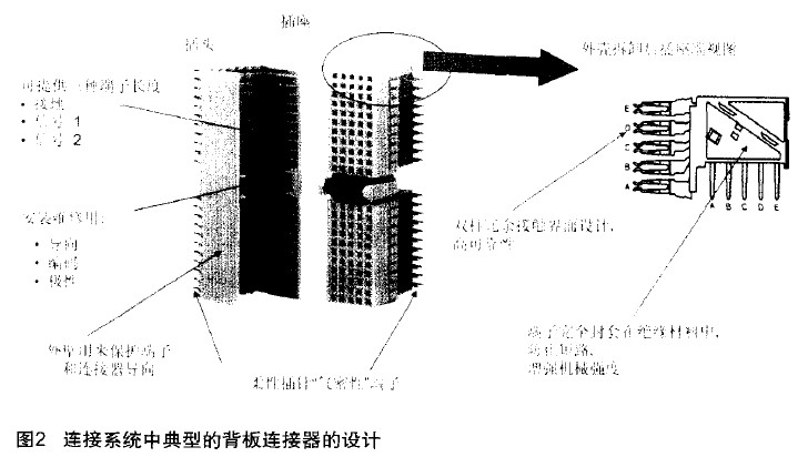 圖2是典型的連接系統(tǒng)中背板連接器的設(shè)計(jì)。它可以提供三種端子長(zhǎng)度,即接地端子、信號(hào)1端子、信號(hào)2端子三個(gè)端子的長(zhǎng)度是不同的。這是為了保證插座和插針在互相連接的時(shí)候,如果接反了,就無(wú)法插入。第二個(gè)是中問(wèn)部分,它是用于安裝維修用的,整個(gè)插針板在插入的過(guò)程中,可以用來(lái)導(dǎo)向,甚至可以保證編碼和極性的正確。外壁用來(lái)保護(hù)端子和連接器的導(dǎo)向,這個(gè)端子就是插針部分,采用柔性插針。從右半部分圖中可以看到,外殼被拆除后,更清楚地顯示出了接觸面。它采用了雙柱冗余的接觸面設(shè)計(jì),這樣可以大大提高接觸的可靠性。