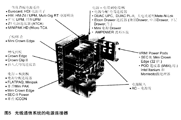 無(wú)線通信系統(tǒng)中所采用的電源連接器(圖5)的種類(lèi)包括一體化背板電源系統(tǒng)、子板/堆疊用連接器、信號(hào)母線到板之間的連接器、板到板的電源連接器、電源到電纜/電纜Nrn; 刷板連接器、微處理器所用電源連接器以及電源輸入所用連接器。