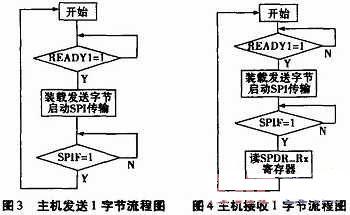 (2)軟件部分:單片機為主控制器,首先查詢從機狀態(tài)標志位READY是否為1,判斷是否可以與從機通信。從機準備就緒時,單片機可裝載1字節(jié)發(fā)送數(shù)據(jù),啟動CPLD內(nèi)部SPI接口電路,查詢并等待SPI傳輸結(jié)束標志位SPIF為1,完成一字節(jié)數(shù)據(jù)傳輸,如此重復。圖3、圖4為主機發(fā)送與接收1字節(jié)流程圖。