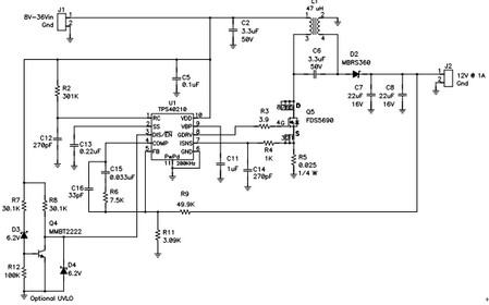 構(gòu)建起如圖3 所示電路,并對(duì)其進(jìn)行描述。該電路可在汽車市場獲得應(yīng)用。這里,其擁有一個(gè)8V 到36V 的寬范圍輸入,可以為穩(wěn)定12-V 輸出以上或者以下。汽車市場更喜歡使用陶瓷電容器,原因是其寬溫度范圍、長壽命、高紋波電流額定值和高可靠性。結(jié)果,耦合電容器(C6) 便為陶瓷的。這就意味著,相比電解電容器,它擁有較高的AC 電壓,同時(shí)這種電路會(huì)對(duì)低漏電感值更加敏感。