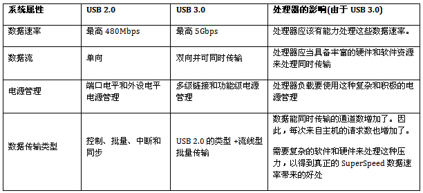 在一個普通的場景中,在device端,處理器直接連接到USB、存儲器和外設。記住這種結構,由High-Speed過渡到SuperSpeed,處理器的影響可以概括如下: