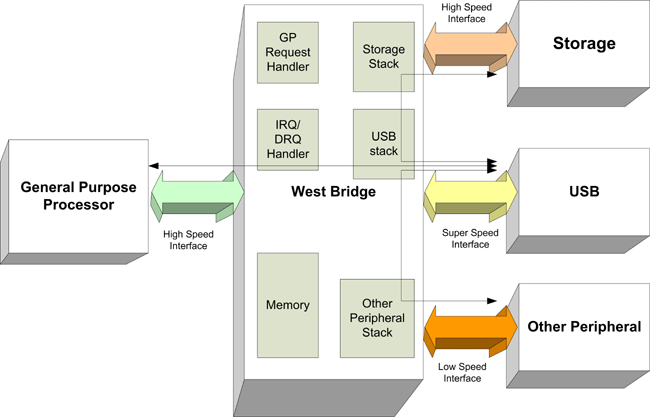 影響通用處理器性能的主要因素取決于中斷的頻率。簡而言之,每次GP收到中斷,內容都需要切換,執(zhí)行ISR,從而增加了其他運行程序的時間。當使用西橋器件時,大部分USB相關中斷由它處理,從而提高了GP的性能。