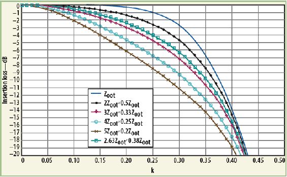 圖4中,對(duì)于優(yōu)化和非優(yōu)化的特性阻抗值,都把插損看作k的函數(shù)。相比采用了優(yōu)化特性阻抗的情況,特性阻抗非優(yōu)化時(shí),插損增加,帶寬減小。于是,使用絞合傳輸線很容易獲得最佳特性阻抗值。