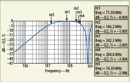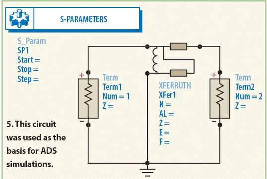 MathWorks的MATLAB數(shù)學(xué)分析軟件曾被用來(lái)分析這種變壓器器件模型的響應(yīng)。分析中,把單獨(dú)的低頻(公式1)響應(yīng)和高頻(公式5)響應(yīng)的插損響應(yīng)結(jié)合在了一起。將所需的目標(biāo)值代入MATLAB公式,可獲得寬帶變壓器的最終響應(yīng)。為了執(zhí)行MATLAB模型數(shù)值響應(yīng)的電氣仿真,使用了ADS建模軟件。該軟件有一個(gè)很有用的內(nèi)部源模型,稱為XFERRUTH,其變量參數(shù)包括匝數(shù)(N)、電感因子(AL)、傳輸線特性阻抗(Z)、傳輸線電氣長(zhǎng)度(E),以及計(jì)算傳輸線長(zhǎng)度所需要的參考頻率(F)。