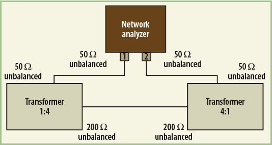 測(cè)量在Advantest的一個(gè)商用VNA,300kHz至3.8GHz模型R3765CG上進(jìn)行。這個(gè)分析儀配有50Ω端接阻抗的非平衡測(cè)試端口。由于寬帶unun阻抗變壓器具有非平衡終端,轉(zhuǎn)換比率為1:4,為了讓該器件與測(cè)試設(shè)備相匹配,需要另一個(gè)轉(zhuǎn)換比率為4:1的器件來(lái)執(zhí)行阻抗轉(zhuǎn)換。圖6和圖7顯示了所有的終端連接。測(cè)試終端和所有用于VNA的線纜都經(jīng)過校準(zhǔn),以最大限度地減少它們出現(xiàn)錯(cuò)誤的可能性。插損和通帶響應(yīng)利用表示為對(duì)數(shù)幅值形式的傳輸系數(shù)S21來(lái)分析。