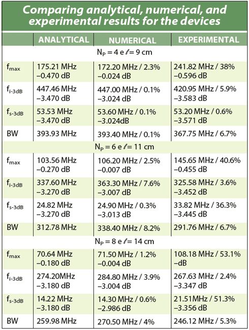 構(gòu)建的第一個(gè)器件線圈匝數(shù)為4,因此傳輸線長(zhǎng)度為9cm。圖8、9和10分別顯示了分析、數(shù)值和實(shí)驗(yàn)三種情況下的頻率插損行為。表中總結(jié)了主要的參數(shù)值,包括最大幅值、-3dB頻率(fmax、fi-3dB和fs-3dB)、適當(dāng)?shù)膸挘˙W),以及相比模型值頻率偏差百分比下的各種插損結(jié)果。通過分析、數(shù)值和實(shí)驗(yàn)方法獲得的結(jié)果間的偏差非常小,信號(hào)頻率最大時(shí)例外。這都是由于測(cè)量設(shè)置中噪聲和其它寄生效應(yīng)造成的測(cè)試系統(tǒng)的局限性。在幅度基本穩(wěn)定的測(cè)試頻帶上,信號(hào)電平的變化是幾乎察覺不到的,也許這就是最大信號(hào)幅度頻率的報(bào)告中出現(xiàn)偏差的原因。