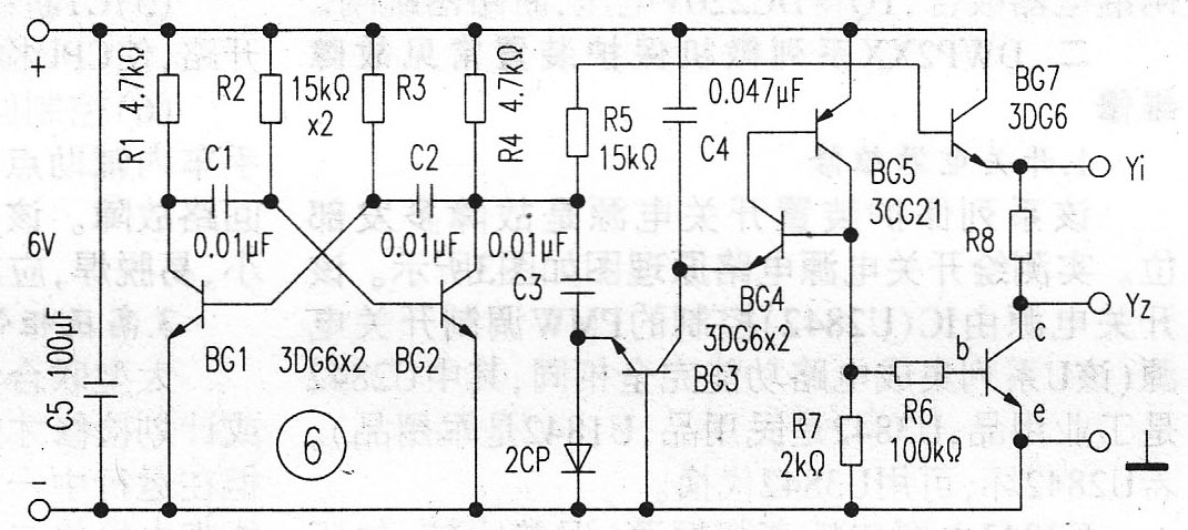 電路圖中的BG1、BG2、R1~R4、C1、C2等組成多諧振蕩器,BG3~BG5、C3、C4等組成階梯波發(fā)生器,詳細工作原理讀者可自行分析,這里就不一一贅述了。