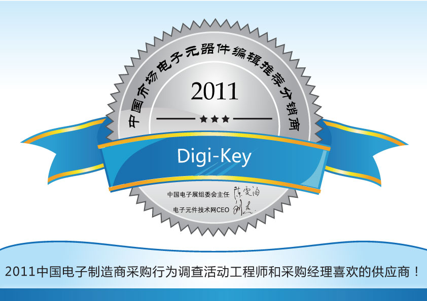 在近日剛剛結(jié)束的2011中國(guó)電子制造商采購(gòu)行為調(diào)查暨中國(guó)市場(chǎng)電子元器件領(lǐng)軍廠商的評(píng)選活動(dòng)中,Digi-key憑借廣泛的電子元器件庫(kù)存、最全面的在線(xiàn)資源和快速響應(yīng)客戶(hù)訂單等多方面優(yōu)勢(shì),以及在工程師心目中形成的良好形象,一舉榮獲2011中國(guó)市場(chǎng)電子元器件編輯推薦分銷(xiāo)商稱(chēng)號(hào)!