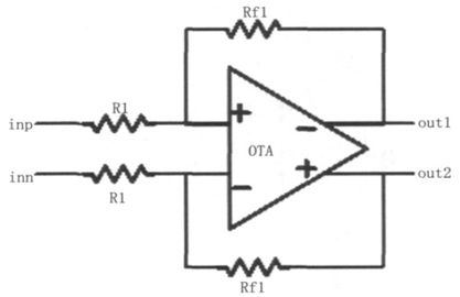 D 類音頻功率放大器的輸入放大級(jí)是基于運(yùn)算放大器(OTA)的閉環(huán)結(jié)構(gòu)來(lái)實(shí)現(xiàn)的,其結(jié)構(gòu)如圖4所示,用來(lái)根據(jù)需要對(duì)輸入的音頻信號(hào)作電平調(diào)整和信號(hào)放大處理,使輸入信號(hào)在幅度方面能滿足后級(jí)電路的要求,輸入放大級(jí)的增益可以通過(guò)設(shè)置Rf1和R1 的阻值來(lái)決定。