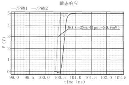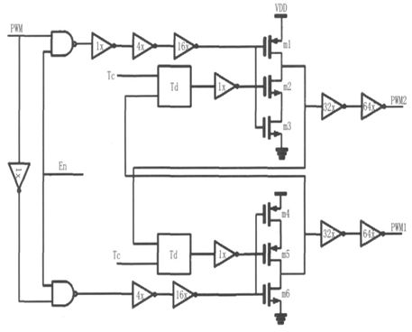 驅(qū)動(dòng)電路結(jié)構(gòu)如圖8 所示,該電路能有效調(diào)節(jié)死區(qū)時(shí)間(N 型、P 型功率開(kāi)關(guān)管同時(shí)關(guān)斷),防止單臂"shoot- through"現(xiàn)象,并有保護(hù)關(guān)斷功能。輸入信號(hào)為比較器輸出的PWM 脈沖信號(hào),PWM1用來(lái)驅(qū)動(dòng)N 型功率開(kāi)關(guān)管,PWM2 用來(lái)驅(qū)動(dòng)P 型功率開(kāi)關(guān)管。為了避免全橋開(kāi)關(guān)電路中的單臂"shoot- through"現(xiàn)象,當(dāng)PWM 信號(hào)從低電平變?yōu)楦唠娖綍r(shí),PWM2 應(yīng)首先變?yōu)楦唠娖剑?關(guān)斷PMOS 功率開(kāi)關(guān)管,隨后PWM1 再變?yōu)楦唠娖剑_(kāi)啟NMOS 功率開(kāi)關(guān)管,如圖9 所示;反之,當(dāng)PWM 信號(hào)從高變?yōu)榈蜁r(shí),PWM1 先變?yōu)榈碗娖?,關(guān)斷NMOS 開(kāi)關(guān)功率管,隨后PWM2 再變?yōu)榈碗娖?,開(kāi)啟PMOS 開(kāi)關(guān)功率管。實(shí)際電路中,可以根據(jù)需要通過(guò)控制延遲單元的控制位Tc 來(lái)調(diào)整死區(qū)時(shí)間的長(zhǎng)短。為減小失真,必須減小死區(qū)時(shí)間,該驅(qū)動(dòng)電路采用了逐級(jí)增加驅(qū)動(dòng)能力的方式來(lái)驅(qū)動(dòng)功率管,從而減小了必要的死區(qū)時(shí)間,保證了低失真度。