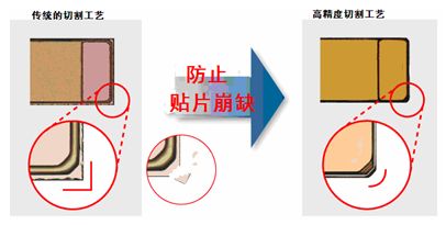 近年來,智能手機市場的需求迅猛增長,多功能化使手機產(chǎn)品的零部件數(shù)量增加,因此,可高密度安裝的超小型零部件的需求隨之增加。但是,以現(xiàn)有的制造技術,切割工藝中的封裝尺寸公差較大,達±20μm,不僅如此,還存在貼片崩缺等各種課題,業(yè)內(nèi)認為0402尺寸以下的開發(fā)是非常困難的。