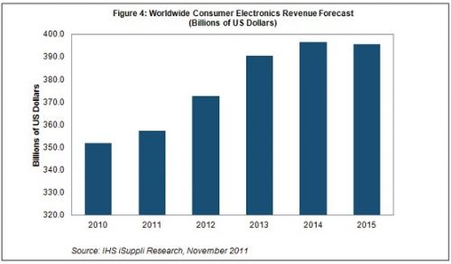 但不都是負面消息。雖然第二和第三季度的消費電子營業(yè)收入低于去年同期水平,但隨著電視與藍光播放器假日銷售高于2010年水平,上述趨勢將從第四季度開始逆轉(zhuǎn)。IHS公司認為,預(yù)計2012和2013年增長率將超過4%,相比于當(dāng)前的低迷狀態(tài),屆時多數(shù)消費電子領(lǐng)域?qū)謴?fù)活力。