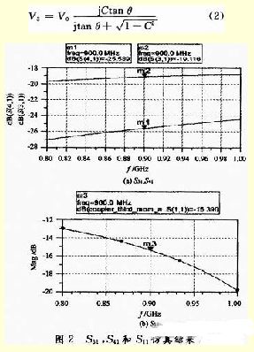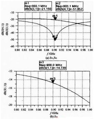圖2(a)是S31和S41的圖,在900MHz時S31為-19.116dB,S41為-25.589dB。圖 2(b)是S11的圖,在800MHz~1GHz之間,S11均在-12dB和-20dB之間。從圖2上可以看出,這個耦合器的性能并不好。首先是S11 在900MHz時僅為-15.39dB,定向耦合器是一個直通的設(shè)備,一般來說S11必須要在-30dB以下才合適,否則插入損耗有些過大,對系統(tǒng)有一些損害。另外定向性過低,在900MHz時,隔離度為-25.589dB,耦合度為-19.116dB,定向性只有6dB左右,而且在整個頻段,定向性都不超過8dB。這個結(jié)果顯然比較符合上文計算的結(jié)果,S11=-15.39dB接近上文中的-14.42dB,而S31=-19.116dB和最大耦合功率的理論值-19.48dB也比較接近。