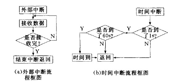 為了確保主機正常工作。加入主機等待分機回復的等待時間。而為了時間的實時性和準確性,用到單片機內部的定時器1.設定其工作模式為模式1,初值為Ox4bff(5Oms)。中斷20次為1s,60次循環(huán)為60s,當60s到時,標志位置位后返回。時間中斷流程圖如圖7(b)所示。