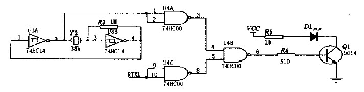 紅外發(fā)送器電路如圖3所示包括38kHz晶體振蕩器、反相器、與非門、驅動門Q1和紅外發(fā)射管D1等部分。其中38kHz晶體振蕩器、電阻R3和反相器組成脈沖振蕩器,用以產生38kHz的脈沖序列作為載波信號,紅外發(fā)射管D1選用Vishay公司生產的TSAL6238,用來向外發(fā)射950nm 的紅外光束。