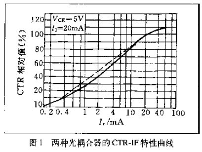 采用一只光敏三極管的光耦合器,CTR的范圍大多為20%~300%(如4N35),而PC817則為80%~160%,達(dá)林頓型光耦合器(如4N30)可達(dá)100%~5000%。這表明欲獲得同樣的輸出電流,后者只需較小的輸入電流。因此,CTR參數(shù)與晶體管的hFE有某種相似之處。線性光耦合器與普通光耦合器典型的CTR-IF特性曲線,分別如圖1中的虛線和實(shí)線所示。