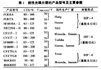 線性光耦合器的典型產(chǎn)品及主要參數(shù)見表1,這些光耦均以光敏三極管作為接收管。