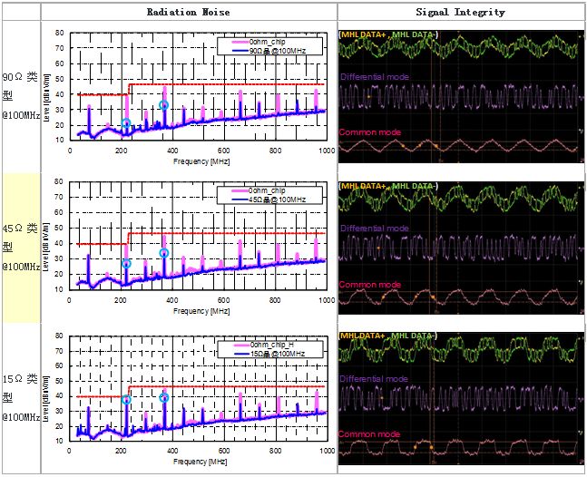 圖5顯示的MHL信號線使用各種共模扼流線圈時的輻射噪聲/信號波形評測結(jié)果。共模扼流線圈在產(chǎn)生噪聲的30MHz~1GHz頻率段內(nèi),按照阻抗由高到低的順序,分別使用以下3種類型(90Ω、45Ω、15Ω@100MHz) (靜態(tài)特性請參考圖6) 來進行測量。