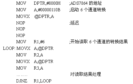 根據(jù)真值表,可以用圖4中的邏輯電路來(lái)實(shí)現(xiàn)這兩個(gè)使能信號(hào)。系統(tǒng)的最終目標(biāo)就是獲取數(shù)據(jù),然后計(jì)算得出結(jié)果。89C51控制ADS7864轉(zhuǎn)換和讀取轉(zhuǎn)換結(jié)果的代碼如下: