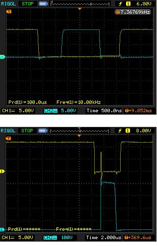 上面的圖是在不加DC400V情況下測(cè)量2管G極波形,下圖是在DC400V情況下,2管的柵極波形。