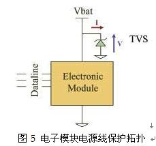 車載模塊的電源線保護是在汽車環(huán)境中需要關注的另一個問題,這個問題涉及ISO7637-2標準。例如,為滿足ISO7637-2標準,特別是圖1中的1、2、3a和3b的脈沖要求,只使用一個瞬變電壓抑制器(TVS)即可有效保護車載模塊。