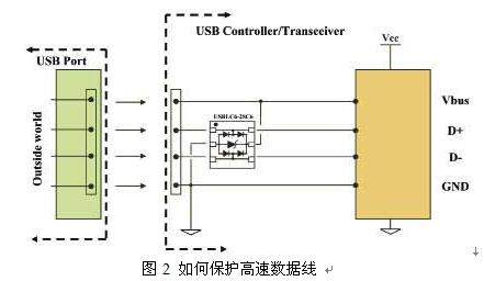這個辦法的實質(zhì)是在USB接口附近連接一個保護元器件。它由幾支采用軌對軌結(jié)構(gòu)的二極管組成,本身具有低電容的特性。內(nèi)部鉗位器件為兩條數(shù)據(jù)線提供±25kV ESD (ISO10605)保護功能,以及為Vbus電源線提供保護功能。