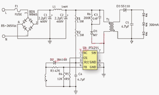 下圖是采用PT4215的3W LED燈杯的典型應(yīng)用電路。驅(qū)動電路采用反激架構(gòu),工作在DCM模式。采用無光藕設(shè)計,方案簡潔可靠,成本低廉。驅(qū)動電路能夠接受85VAC~265VAC輸入范圍,輸出電流300mA,驅(qū)動3顆1W LED串聯(lián)的燈串。